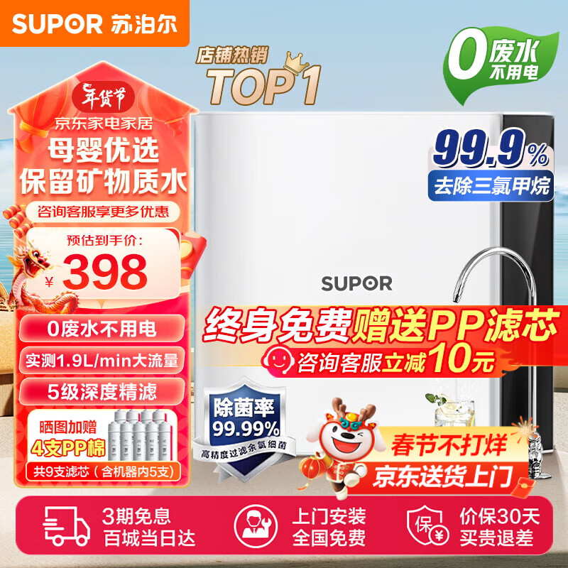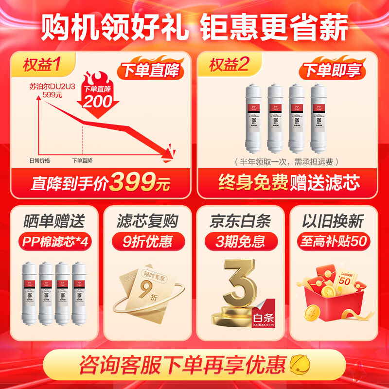 苏泊尔(SUPOR)净水器家用超滤机滤水器自来水厨下式净化器DU2U3厨房饮水水龙头台式台上台下过滤器净水机价格:398.00元!