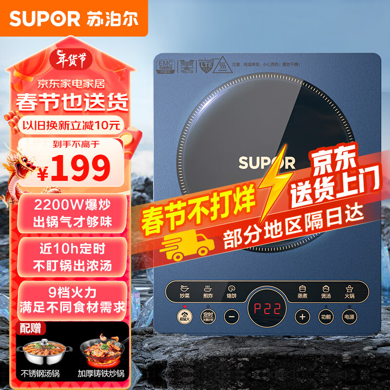 苏泊尔(SUPOR)电磁炉 火锅炉 2200W大功率 智能触控 黑晶面板 家用电磁灶套装C22-IH65E8(赠汤锅+炒锅)价格:199.00元!