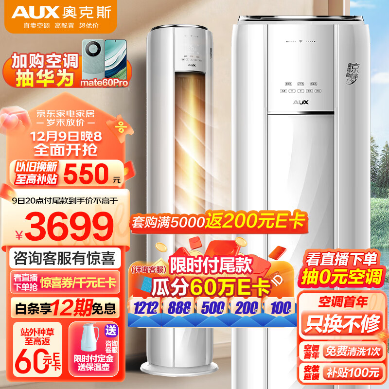 奥克斯(AUX)2匹 京梦 新3级能效 快速冷暖 一键超远风 立柜式空调柜机(KFR-51LW/BpR3AQE1(B3))WiFi智控价格:3799.00元!