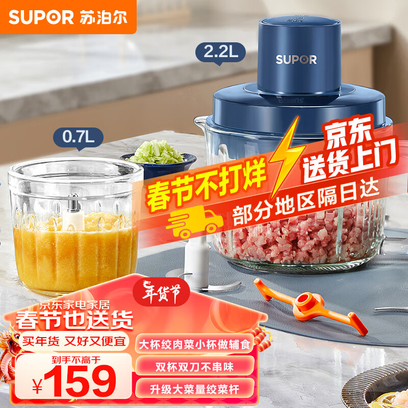 苏泊尔(SUPOR)绞肉机家用 多功能子母双杯双刀小型婴儿辅食机宝宝料理机 2.2L大容量碎肉碎菜绞馅绞蒜泥JR55U-ZM价格:159.00元!