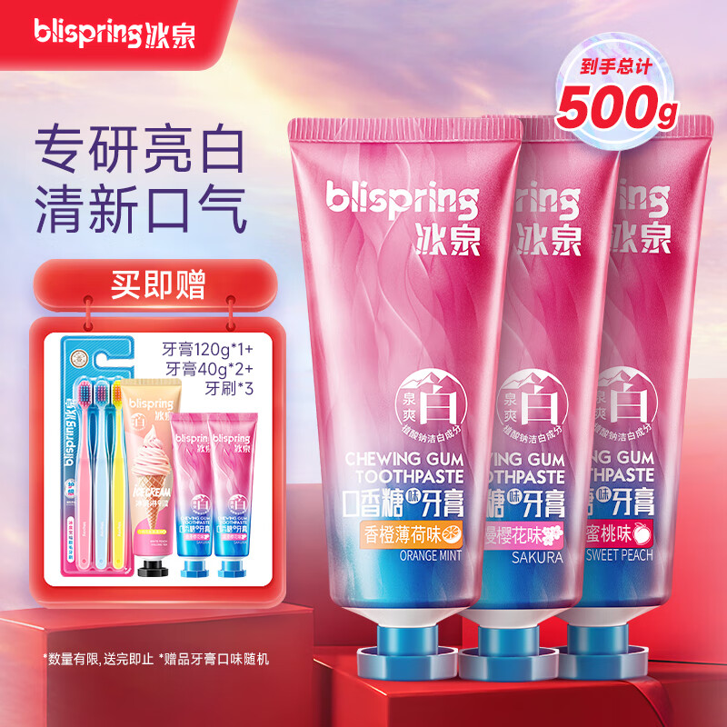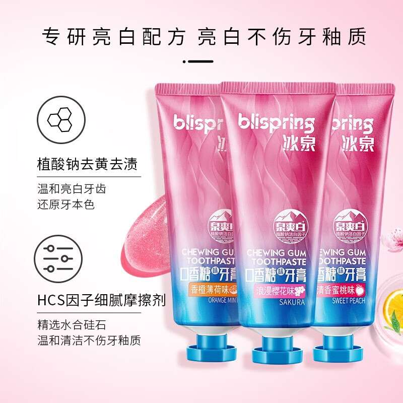 冰泉(blispring)口香糖味牙膏100g×3支家庭装(清香蜜桃+浪漫樱花+香橙薄荷)价格:59.90元!