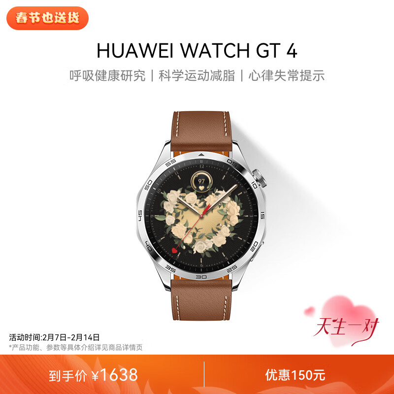 华为WATCH GT4华为手表智能手表呼吸健康研究心律失常提示华为gt4手表山茶棕支持龙年表盘价格:1638.00元!