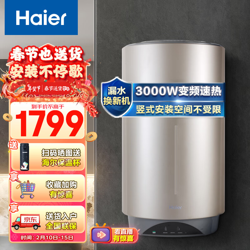 海尔(Haier)竖式电热水器3000W变频速热一级节能省电手机智控高温杀菌立式热水器ES60V-V3U1价格:1899.00元!