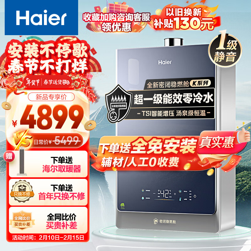 海尔(Haier)16升燃气热水器天然气超一级能效 无级变频水伺服 五段微火控温 TSI增压 JSLQ27-16KLN-ECO7FLRGU1价格:5399.00元!