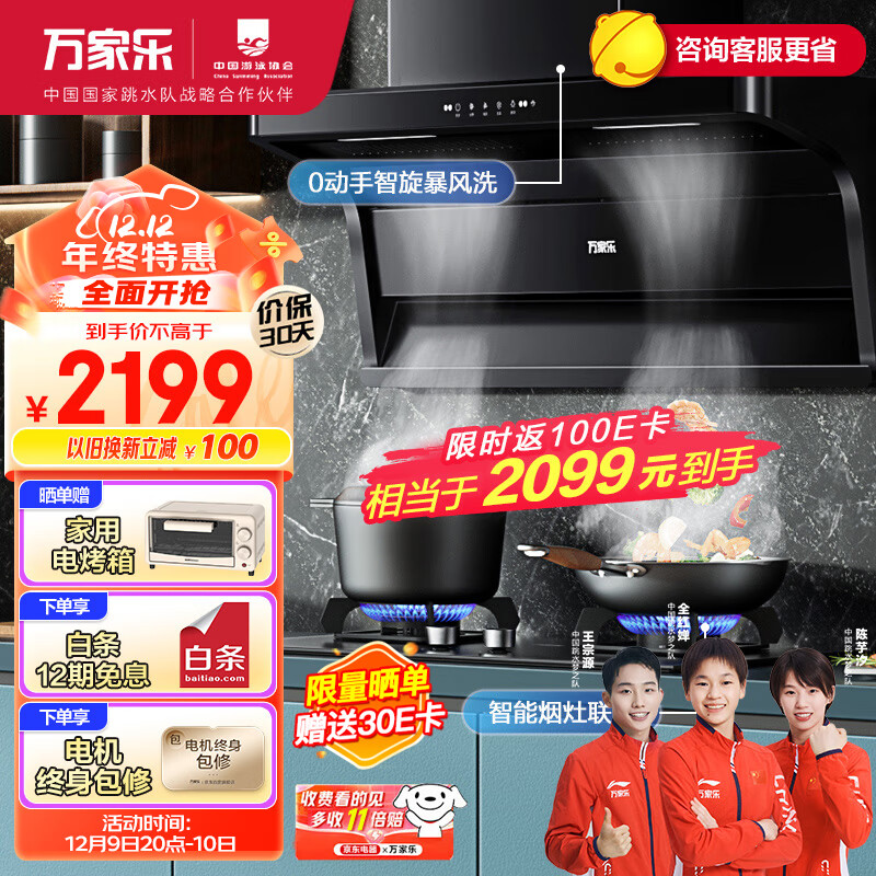万家乐 抽油烟机顶侧双吸油烟机 7字型烟灶联动套装 23m3/min大吸力油烟机燃气灶具套装AK6+KV063B液化气价格:2299.00元!