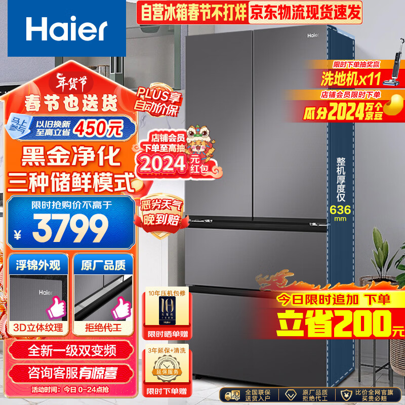 海尔(Haier)468L多门四开门法式电冰箱家用风冷无霜母婴一级能效变频节能智能净味超薄嵌入BCD-468WGHFD5DSMU1价格:3999.00元!
