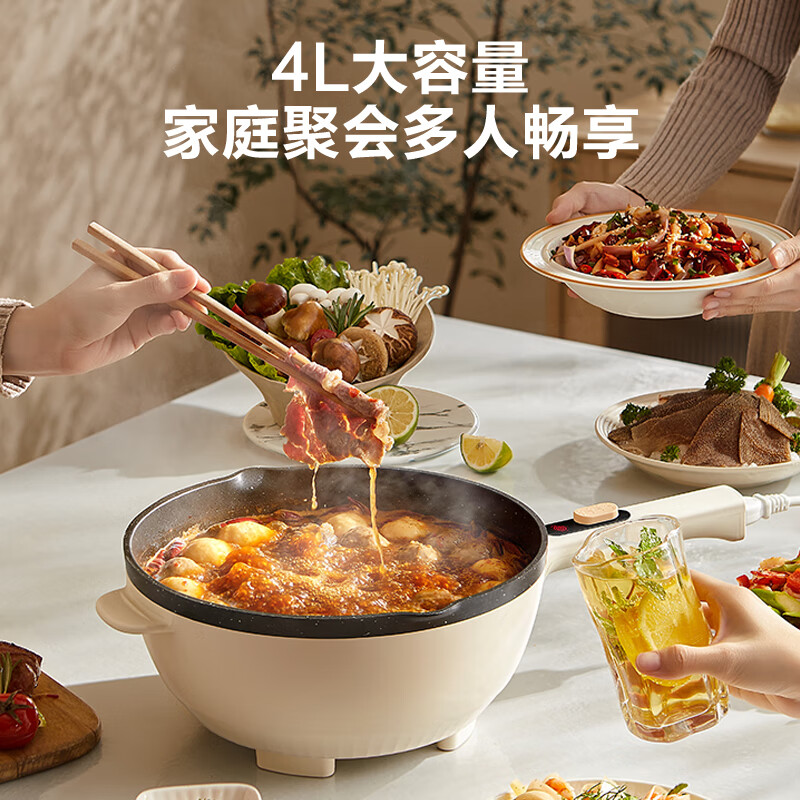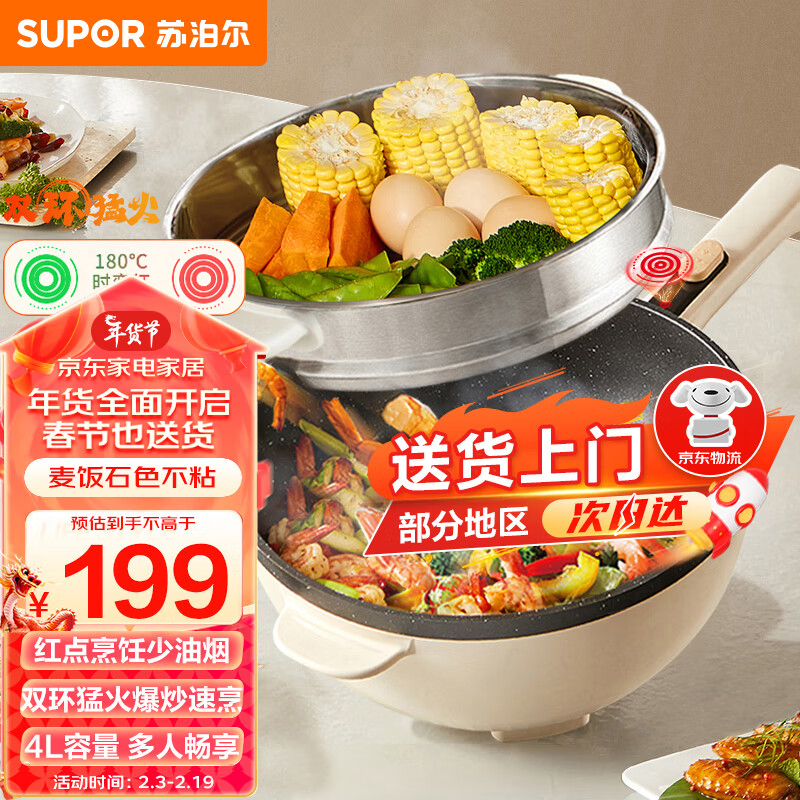 苏泊尔(SUPOR)电炒锅 电煮锅 电火锅 电蒸锅 家用电锅多功能蒸煮 一体 4L大容量炒菜锅多用途 CJ28A813配蒸笼价格:199.00元!