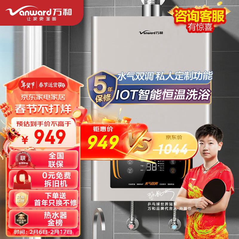 万和(Vanward)14升燃气热水器 天然气家用智能恒温节能自适温智水气双变频JSQ27-521J14【金榜爆品】价格:1044.00元!
