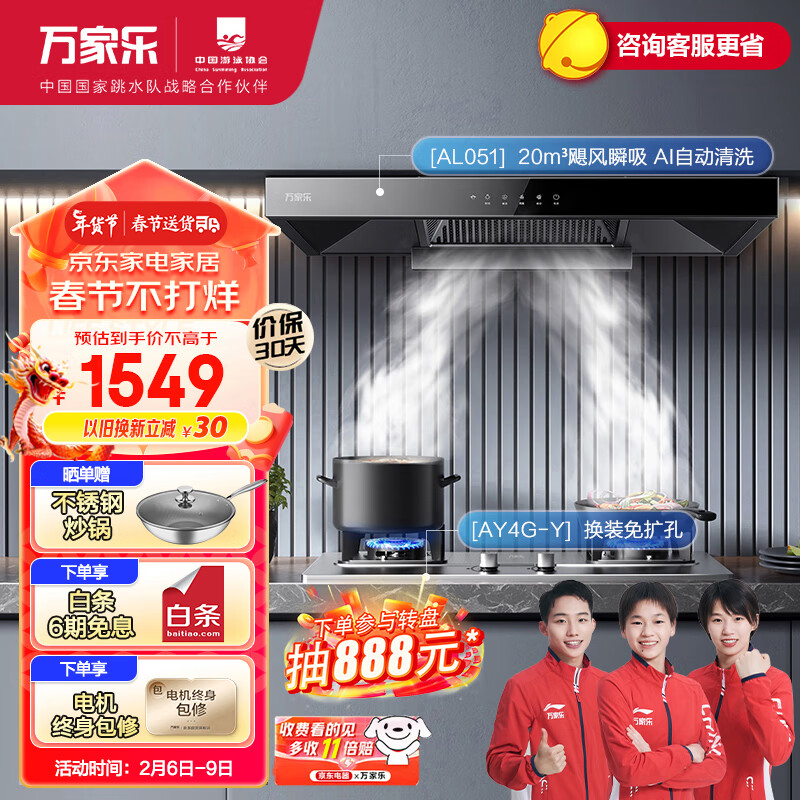 万家乐抽油烟机 欧式烟灶套装 20立方挥手自清洗油烟机4.5kW不锈钢免扩孔煤气灶具套装AT051+AY4G液化气价格:1749.00元!