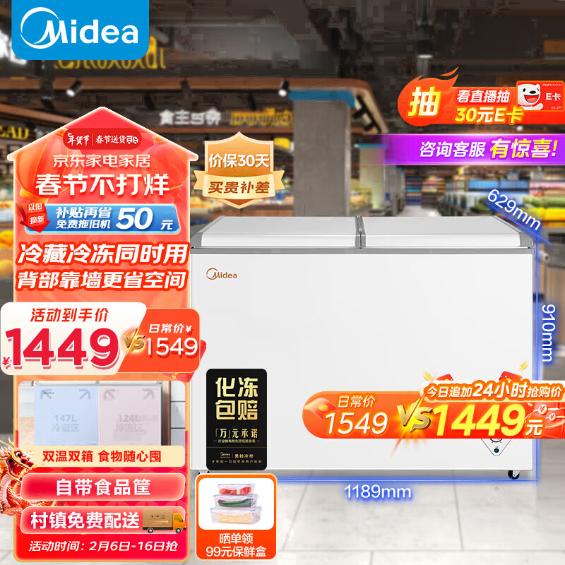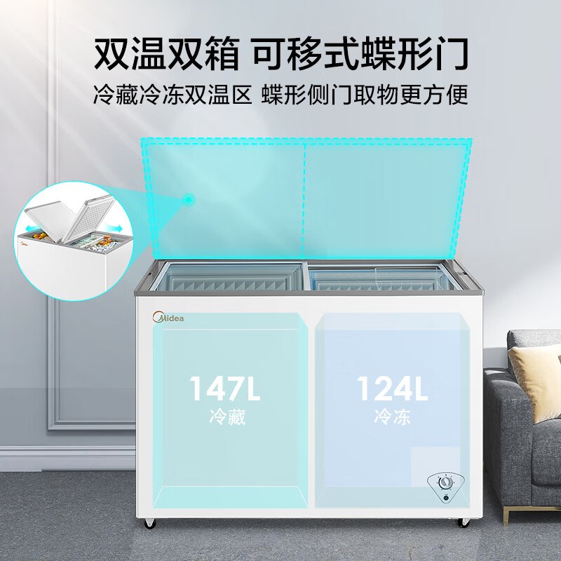美的(Midea)271升 商用家用囤货冰柜 大容量冷藏冷冻双箱双温冷柜 可移动蝶形门卧式冰箱BCD-271VMQ 以旧换新价格:1549.00元!