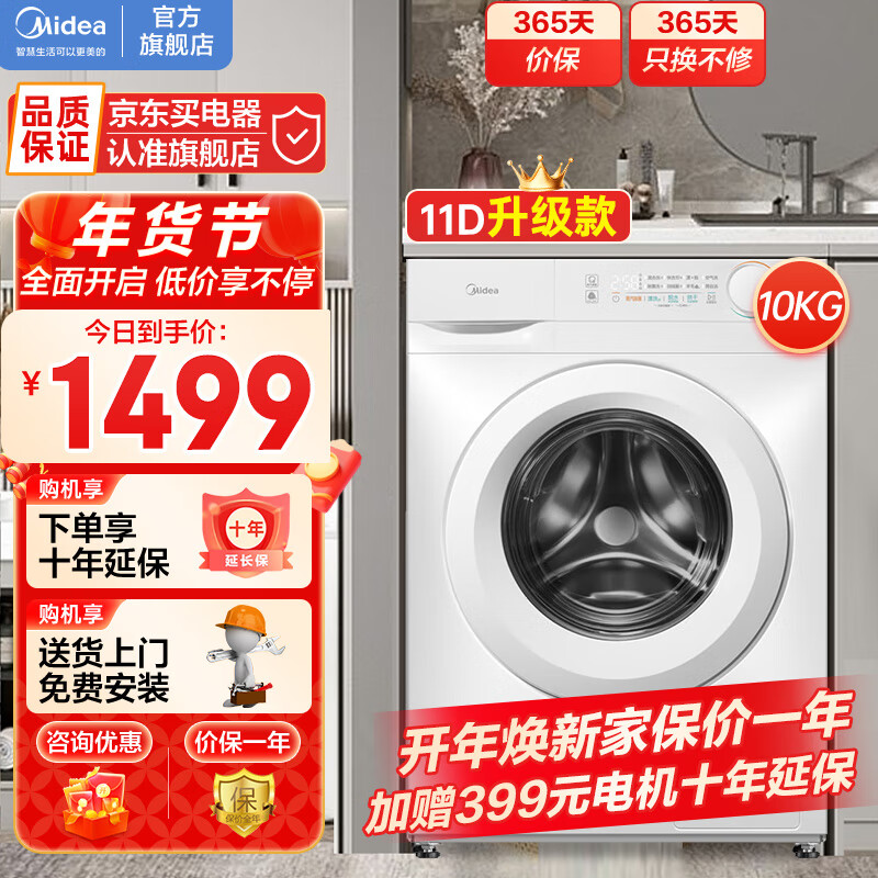 美的(Midea)滚筒洗衣机全自动变频节能 蒸汽除菌洗10公斤MG100V11F(V11D升级款)[官方直发]价格:1449.00元!