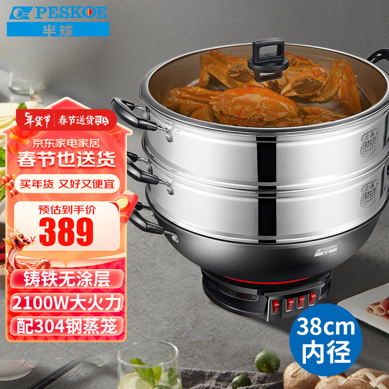 半球(Peskoe)电蒸锅多用途锅电热锅 加厚铸铁锅身电炒锅 38CM电锅电煮锅 304钢双层蒸笼JF-38价格:389.00元!