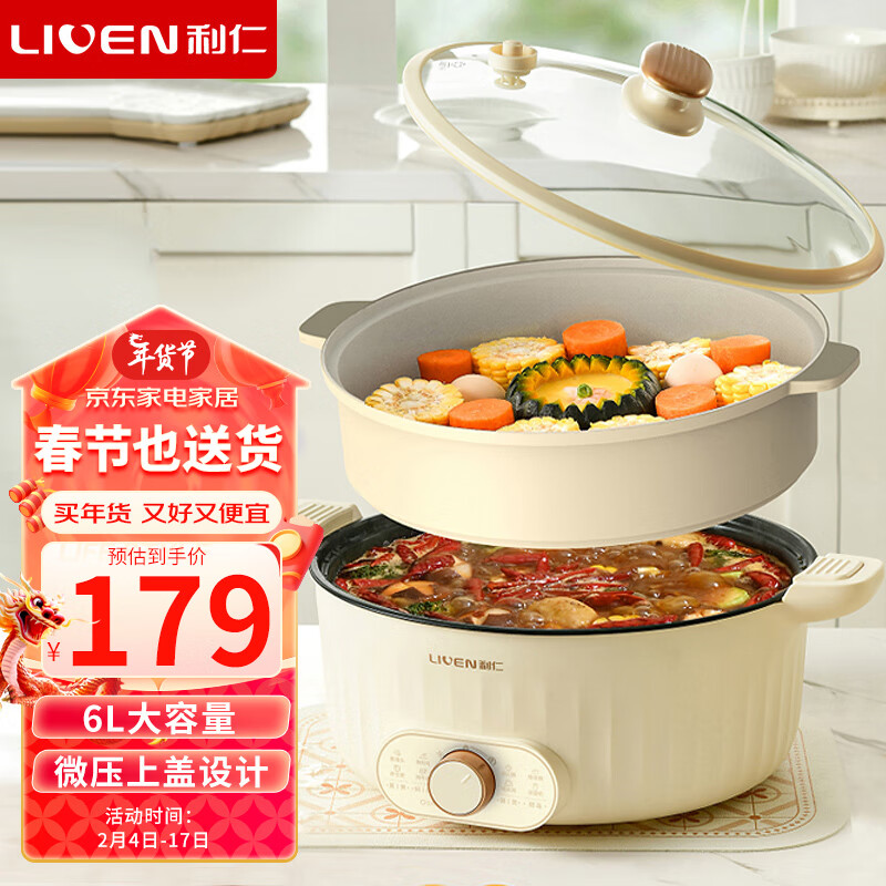 利仁(Liven)电煮锅电蒸锅电炒锅电火锅专用锅家用火锅锅具电热锅多用途烤肉锅辅食锅蒸蛋器微压锅6升 DHG-J656价格:179.00元!