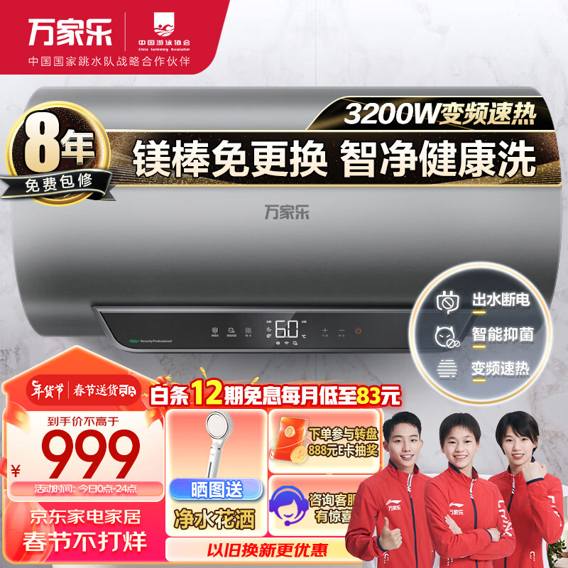万家乐电热水器50升 储水式一级能效3200W速热 镁棒免换出水自动断电智能灭菌D50-FW5价格:1199.00元!
