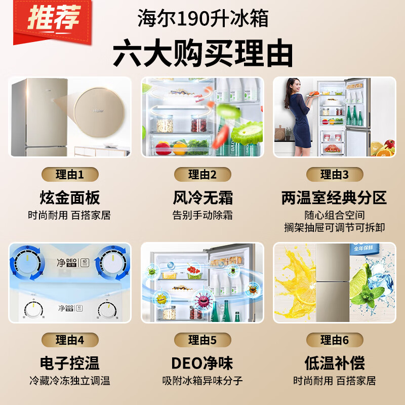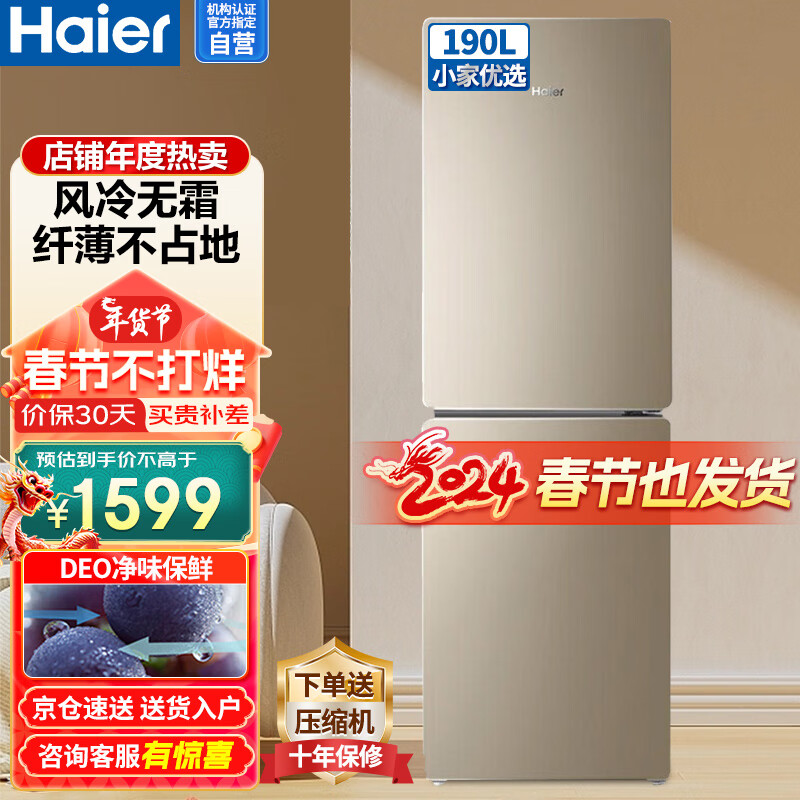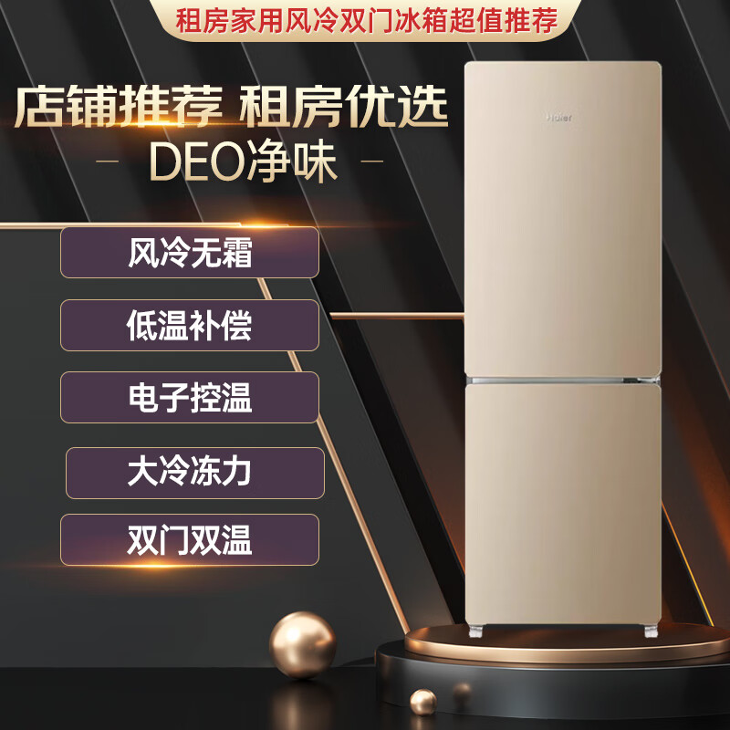 海尔(Haier)冰箱190升双开门二门风冷无霜家用租房宿舍办公室小型迷你两门节能省电净味保鲜电冰箱BCD-190WDPT价格:1599.00元!