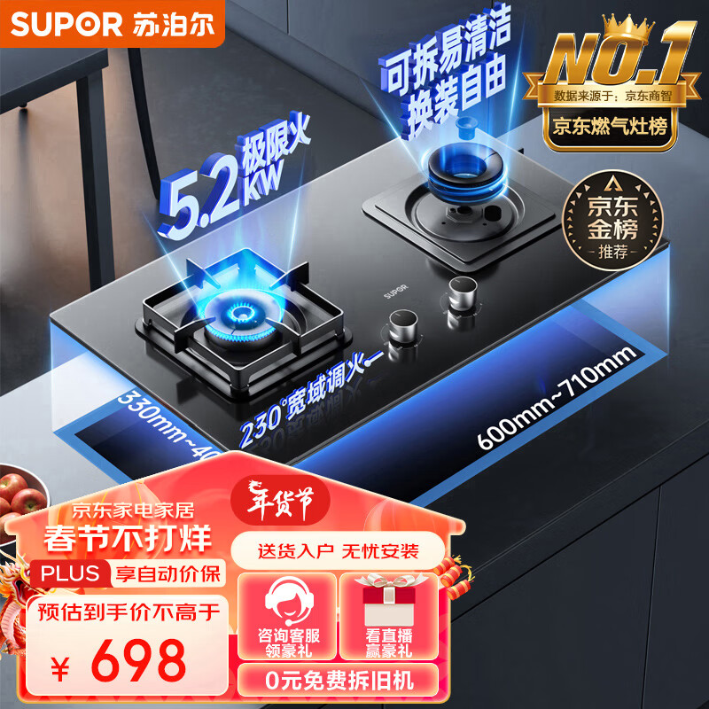 苏泊尔(SUPOR)燃气灶双灶家用 液化气双灶具5.2kW火力 可调节底盘 63%热效率 230°宽域控火燃气灶具 DB28液价格:698.00元!