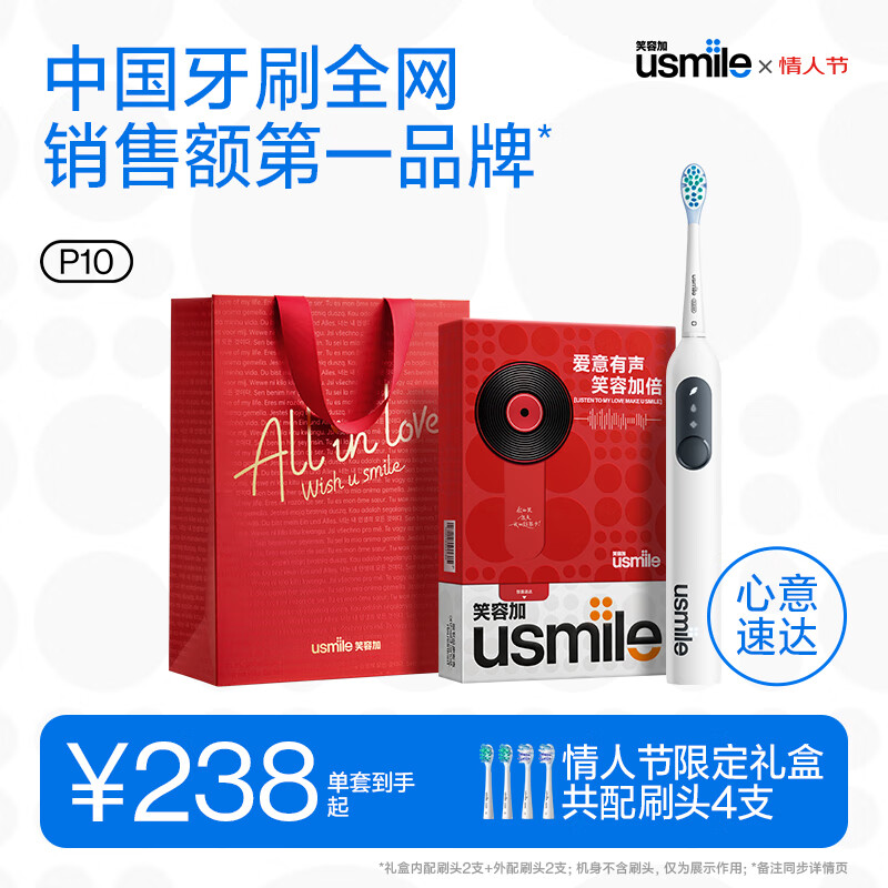 商品名称:usmile成人电动牙刷P10昆仑白+缓震亮白刷头2支装