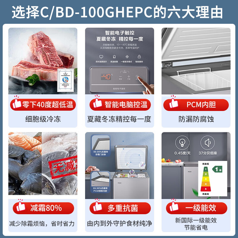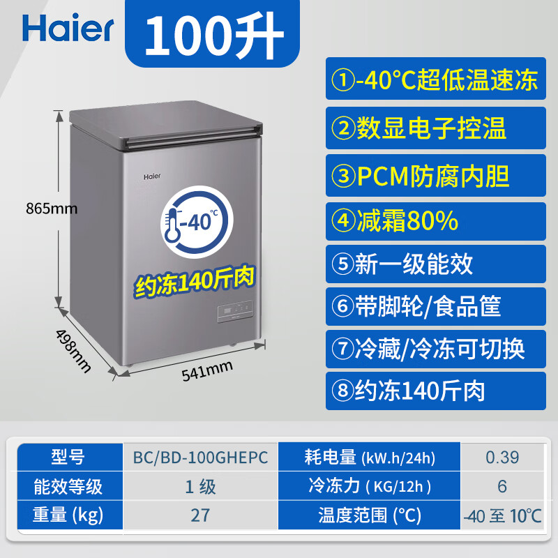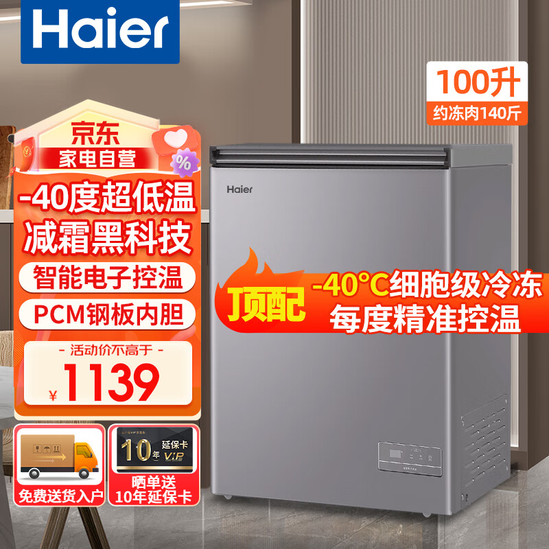 海尔(Haier)冰柜家用小型100升零下-40度超低温减霜80%速冻海鲜冷冻柜电子控温BC/BD-100GHEPC价格:1139.00元!