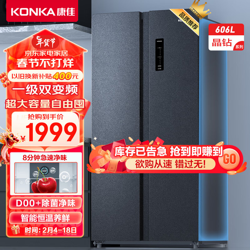 康佳606升双变频一级能效超大容量超薄嵌入式冰箱风冷无霜双循环对开双开门家用电冰箱BCD-606WEGQ5SP价格:1999.00元!