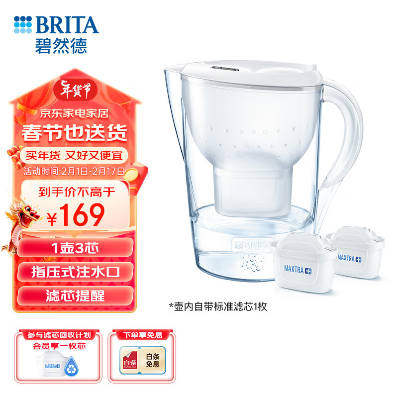 碧然德(BRITA)过滤净水器 家用滤水壶 净水壶 Marella 海洋系列 白色+多效滤芯2枚(含组套)价格:169.00元!