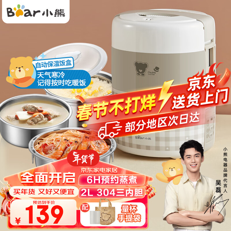 小熊(Bear)电热饭盒 2L双层热饭神器不锈钢内胆上班族保温 自热饭盒加热饭盒办公室带饭蒸饭器 DFH-A20D1价格:139.00元!