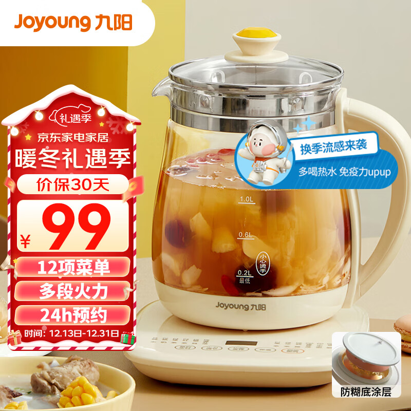 九阳(Joyoung)养生壶玻璃花茶壶 12大功能 1.5L专注炖煮 防糊底 电热水壶 K15F-WY175价格:99.00元!