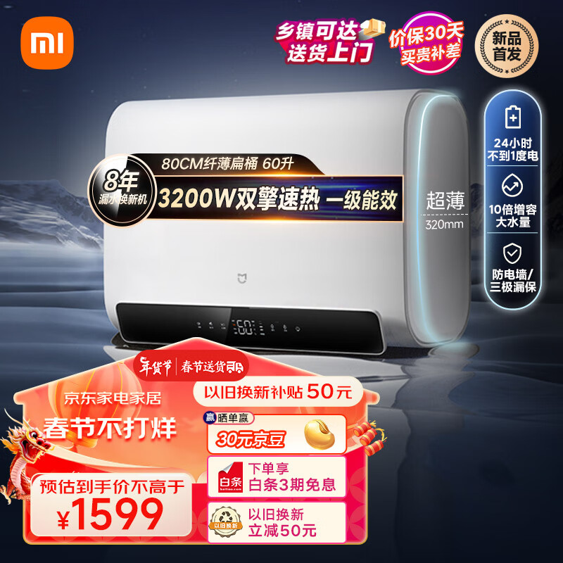 米家小米储水式电热水器60升S1大水量 智能纤薄双胆扁桶双棒3200W速热互联一级能效节能家用EWH60-MJ01价格:1499.00元!