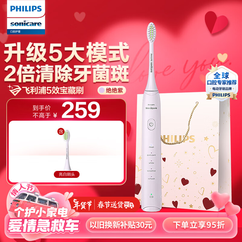 飞利浦(PHILIPS)电动牙刷成人情侣款 新年 情人节礼物送女友/男友 软毛柔和亮白刷头5效宝藏刷 绝绝紫HX2471/02价格:259.00元!