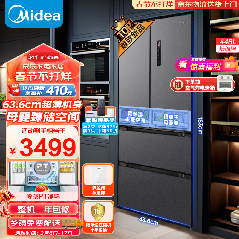 美的(Midea)470变频一级能效节能法式四开门多门超薄母婴冰箱风冷无霜大容量家用智能MR-470WFPZE价格:3599.00元!