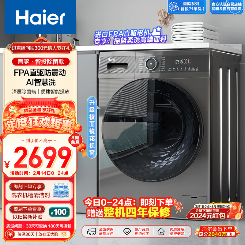海尔(Haier)滚筒洗衣机全自动 直驱单洗旗舰款 10公斤大容量 直驱变频防震动 智能投放 以旧换新 EG100MATE71S价格:2699.00元!