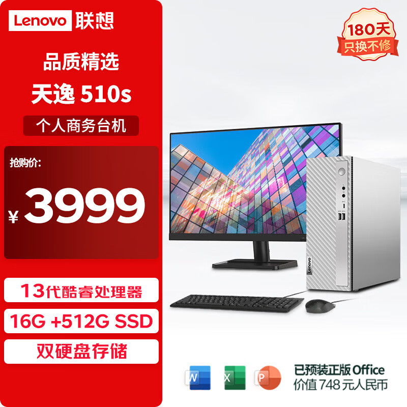 联想(Lenovo)天逸510S个人商务办公台式机电脑主机(酷睿13代i5-13400 16G 512G SSD win11)23英寸显示器价格:3999.00元!