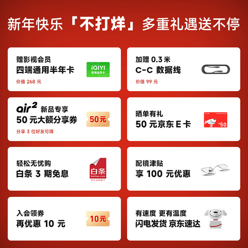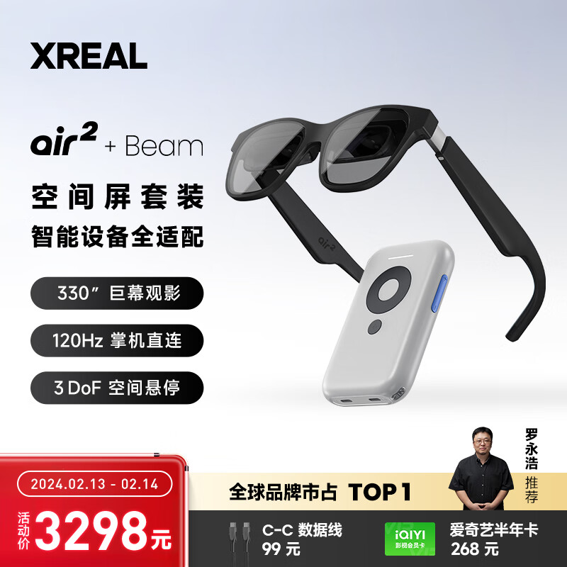 XREAL Air 2 智能AR眼镜 330英寸巨幕 3DoF空间悬停 非VR眼镜 Beam全适配套装 同vision pro投屏体验价格:3598.00元!
