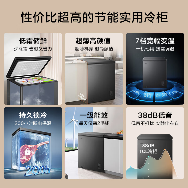 TCL 100升低霜节能冷柜小型冰柜38分贝7档宽幅变温顶开卧式家用冷藏冷冻转换冷柜BD/BC-100FQD价格:599.00元!