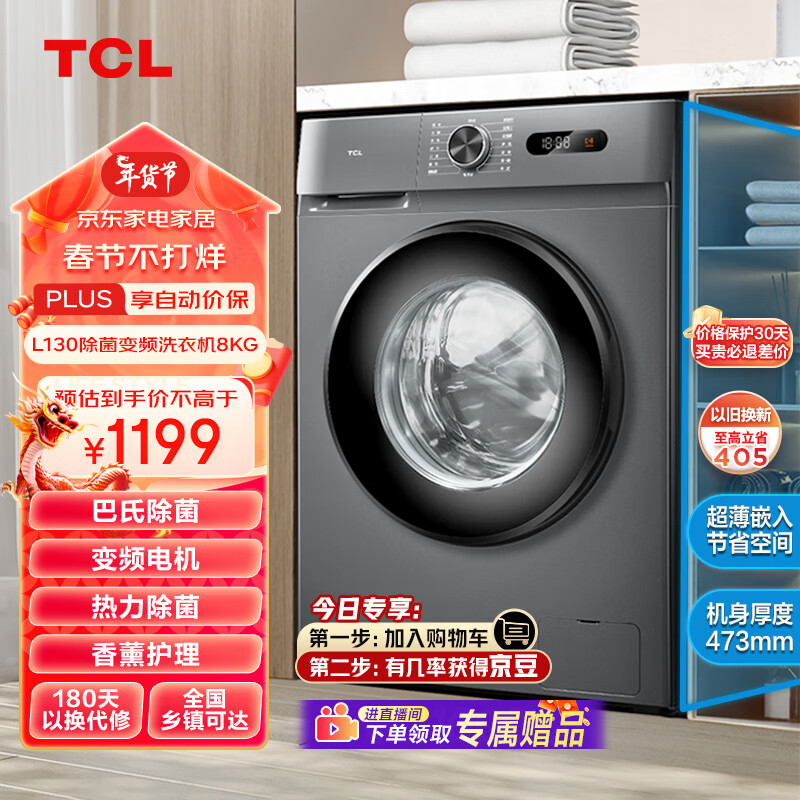 TCL 8KG除菌变频洗衣机 L130 巴氏除菌 一级能效 中途添衣 除菌率≈100% G80L130-B价格:1199.00元!