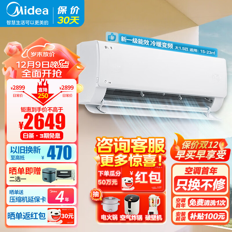 美的(Midea)空调 酷省电挂机 1.5匹新一级能效变频冷暖 家用卧室壁挂式 防直吹自清智能家电 KFR-35GW/N8KS1-1价格:2649.00元!