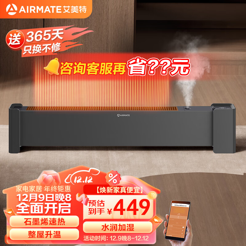 艾美特(AIRMATE)石墨烯取暖器/电暖器/电暖气片家用/暖风机/移动地暖WIFI智能互联加湿防水烤火炉踢脚线 WD22-A18价格:549.00元!