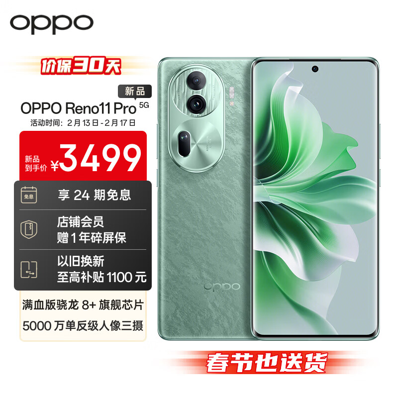 OPPO Reno11 Pro 5000万单反级人像三摄 骁龙8+旗舰芯 12GB+512GB 松石绿 游戏拍照 学生5G AI手机价格:3499.00元!