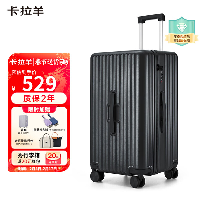 卡拉羊行李箱20英寸可登机大容量拉杆箱男女魔方体旅行箱CX8118钢琴黑价格:629.00元!