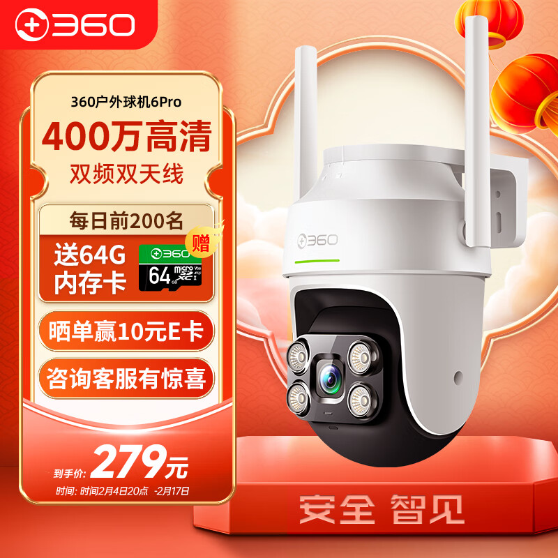 360室外摄像头6pro家用无线手机远程监控宠物户外360度自动旋转无死角可对话家庭监控高清防水夜视价格:279.00元!
