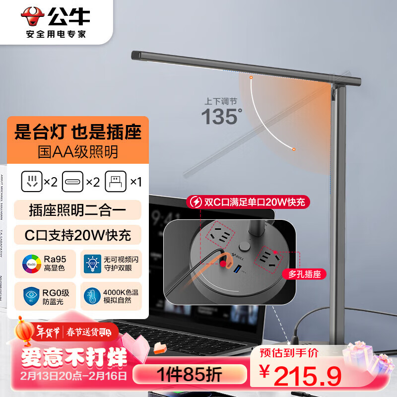 公牛(BULL)插座台灯至臻款国AA级照度GN-X202U深空灰C口20W快充价格:254.00元!