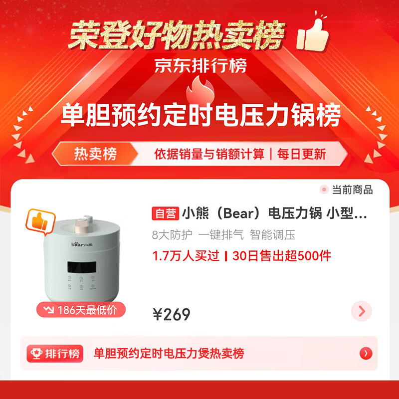 小熊(Bear)电锅 电高压锅 小型智能高压电饭锅 家用多功能迷你可打火锅自动控压 YLB-A25F1 2.5升单胆价格:289.00元!