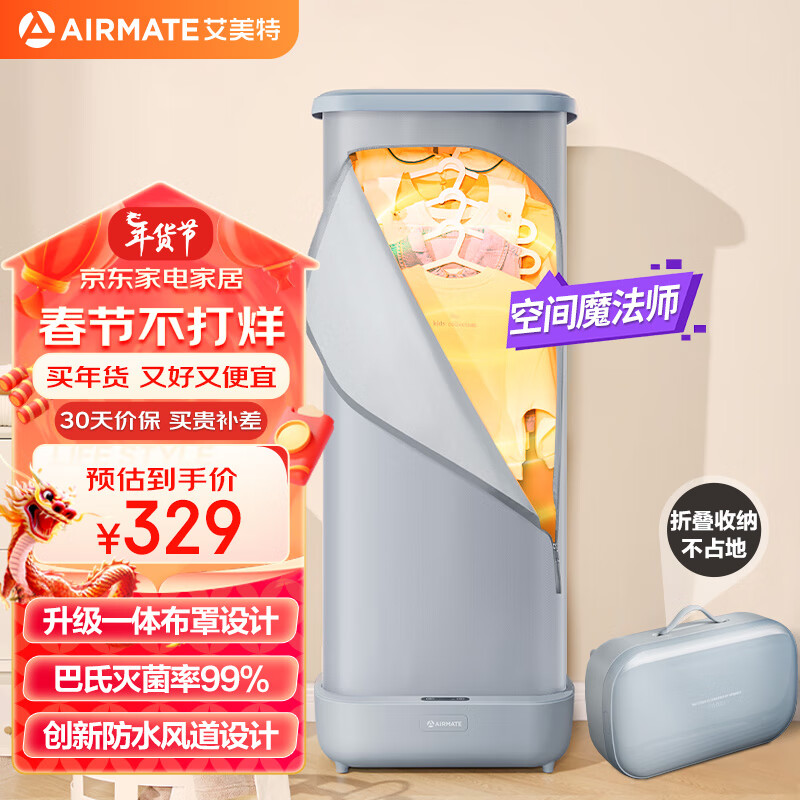艾美特(AIRMATE)【可折叠】烘干机家用折叠干衣机小型烘衣机婴儿衣物暖风定时烘干宿舍衣柜便携收纳烘衣机HG08-M7价格:397.00元!