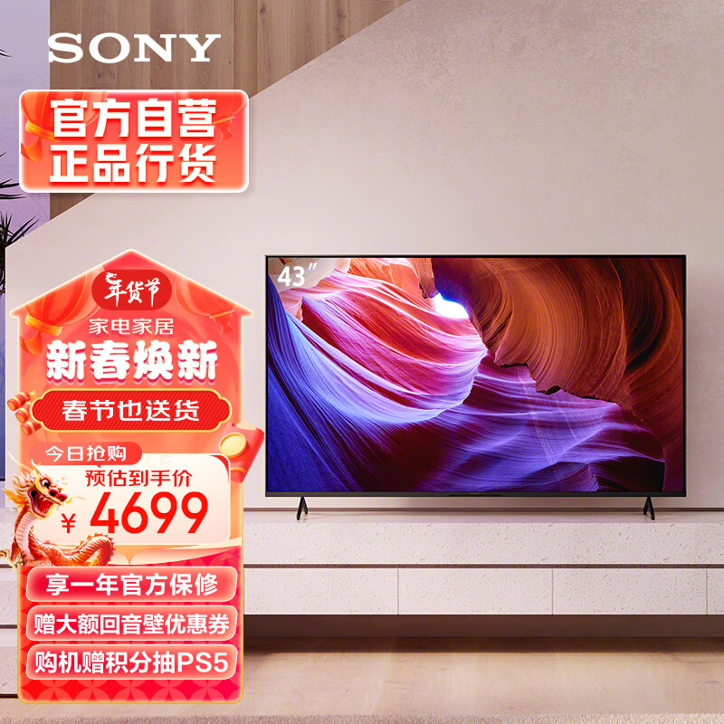 索尼(SONY)【官方直营】KD-43X85K 43英寸 4K HDR 屏智能电视 广色域 120Hz高刷 X1芯片 京配上门价格:4699.00元!