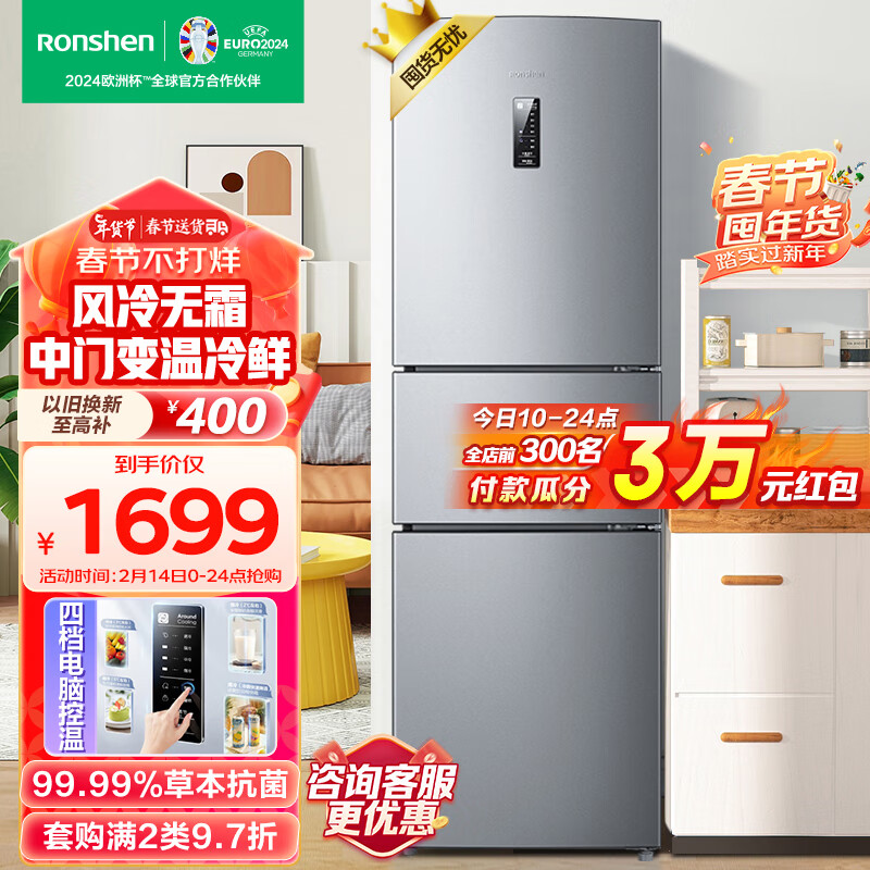 容声(Ronshen)218升三开门小冰箱家用小型风冷无霜节能租房宿舍小巧不占地BCD-218WD12NY中门软冷冻价格:1498.00元!