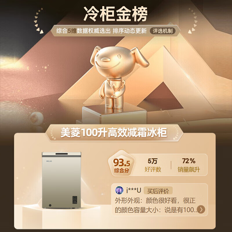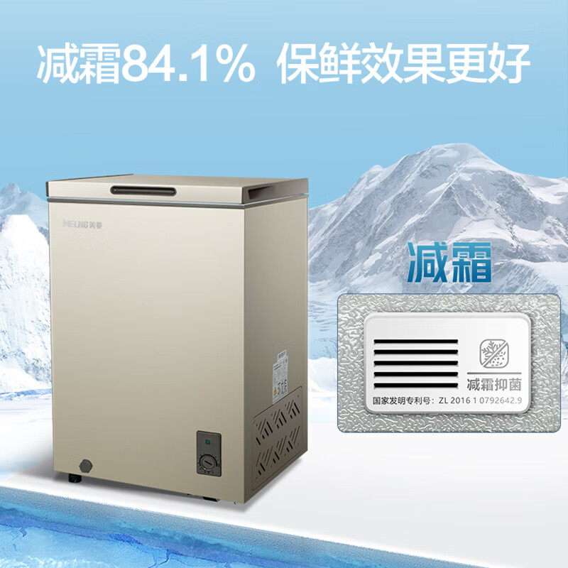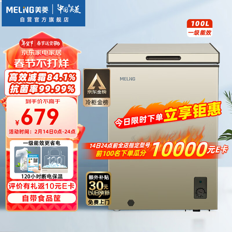 美菱(MeiLing)100升减霜家用单温冰柜冷藏冷冻转换小冷柜小冰箱一级节能省电顶开门BC/BD-100DT金色以旧换新价格:679.00元!