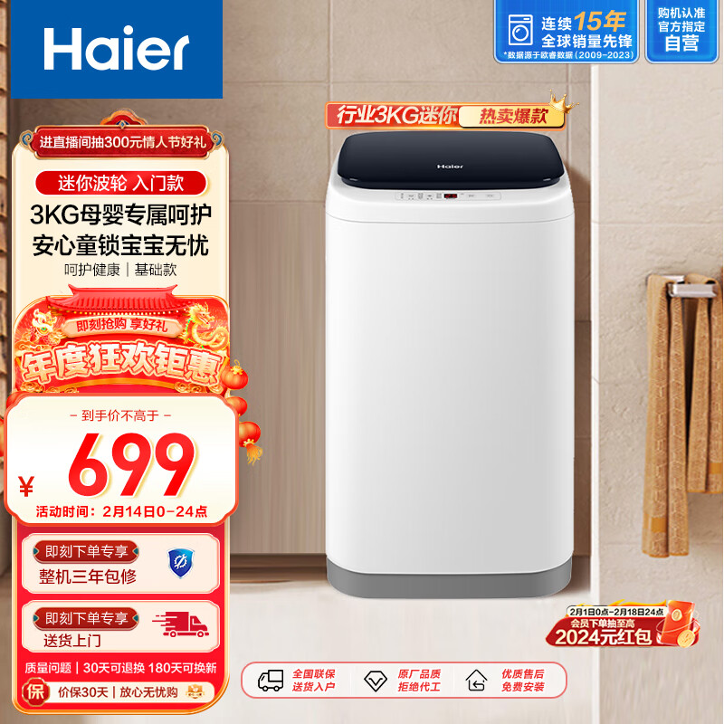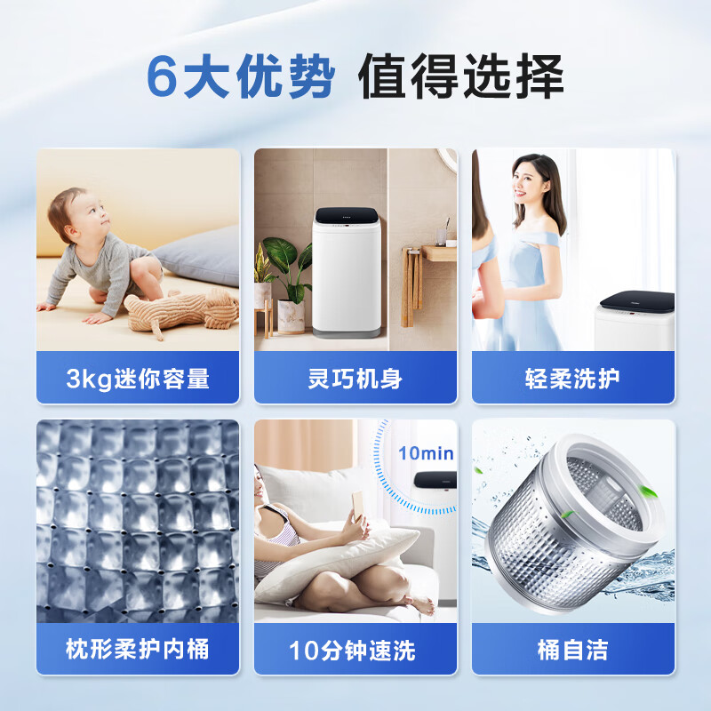 海尔(Haier)婴儿洗衣机 波轮洗衣机迷你 儿童洗衣机 洗衣机小型 宝宝洗衣机 3公斤母婴专属柔护内桶XQBM30-218价格:699.00元!