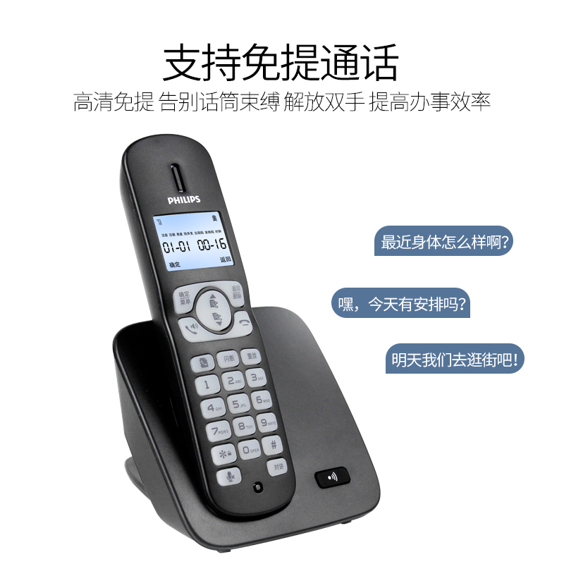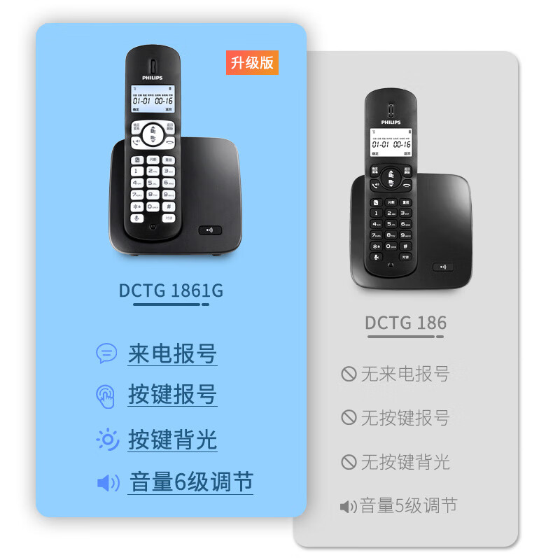 飞利浦(PHILIPS)无绳电话机 无线座机 子母机 办公家用 屏幕白色背光 全新升级 DCTG1861G 黑色价格:239.00元!