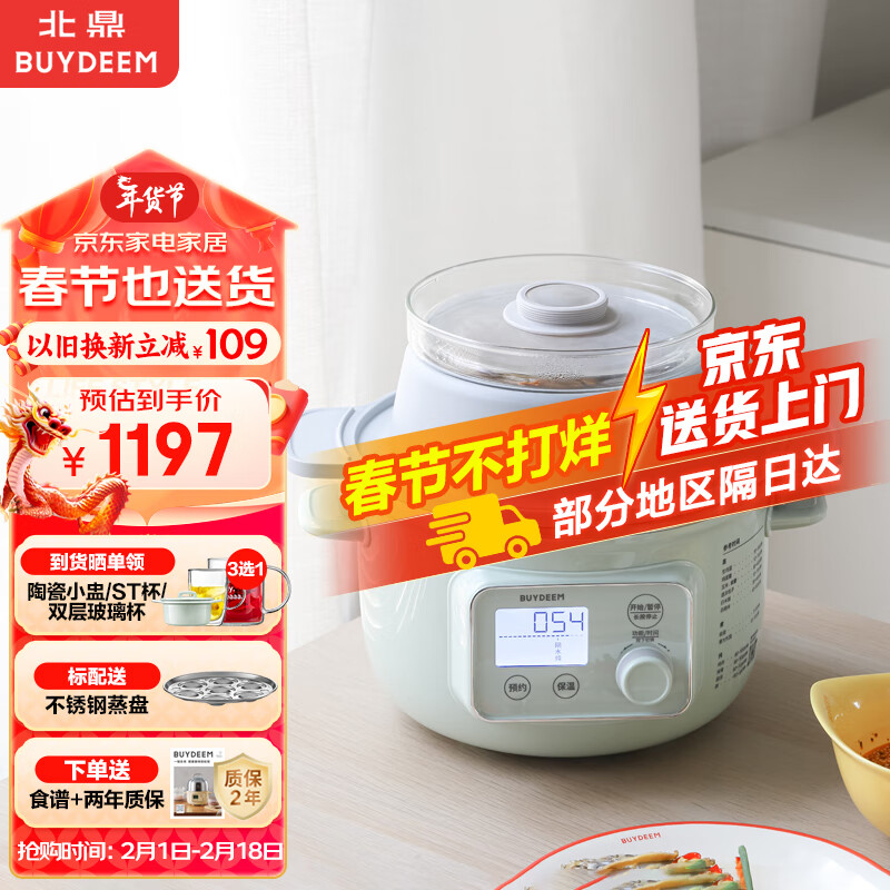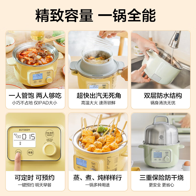 北鼎(Buydeem)家用迷你电煮锅电火锅多功能全自动预约多用途锅【浅杉绿G37 含炖盅+陶瓷蒸蛋盘】年货送长辈价格:1197.00元!