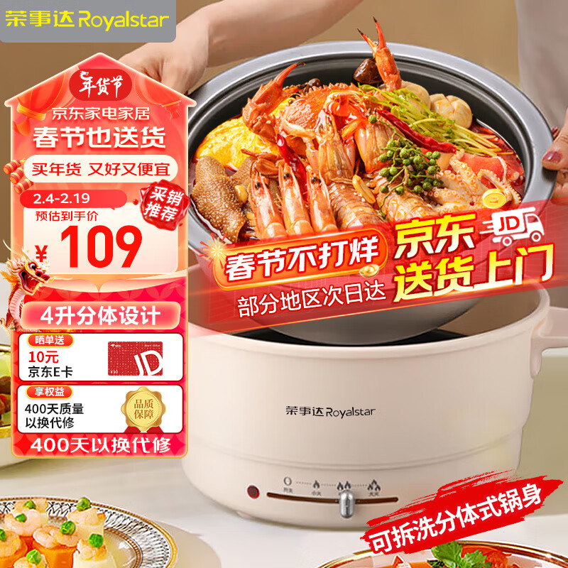 荣事达(Royalstar)电火锅电炒锅电煮锅多功锅涮锅家用分体式焖锅电暖锅大容量大功率火锅可拆锅电热锅RHG-40QL价格:109.00元!