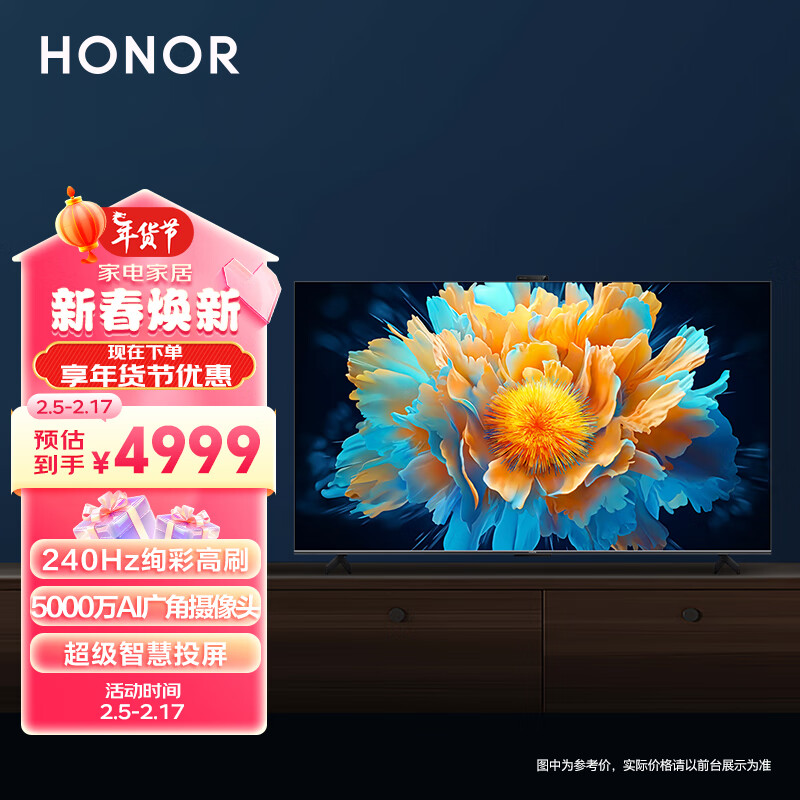 荣耀(HONOR)智慧屏5 75英寸 240Hz绚彩高刷 5000万AI广角摄像头 超级智慧投屏 莱茵认证无频闪护眼 HN75TAG价格:4999.00元!